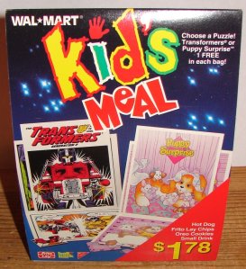 This is a Generation 2 Wal-Mart Kids Meal table advertisement. I wonder how many of these still exist. Collecting was big by the 1990’s, so I’m sure a pretty good number of them have survived. Older stuff isn’t so lucky. I hate to think about how many things people threw out back in the day that I would so love to have now. In 1986, Ziploc did a Transformers promotion. There were five different iron-ons available. I have them all, but what I don’t have is any Ziploc boxes with the Transformers offer on it. Millions of them must have ended up in landfills and have long since disintegrated. That’s the way it goes, I guess. Here are the Ziploc iron-ons, if you’re curious.