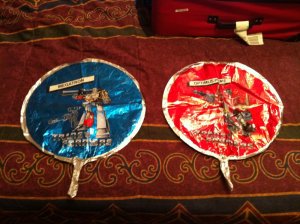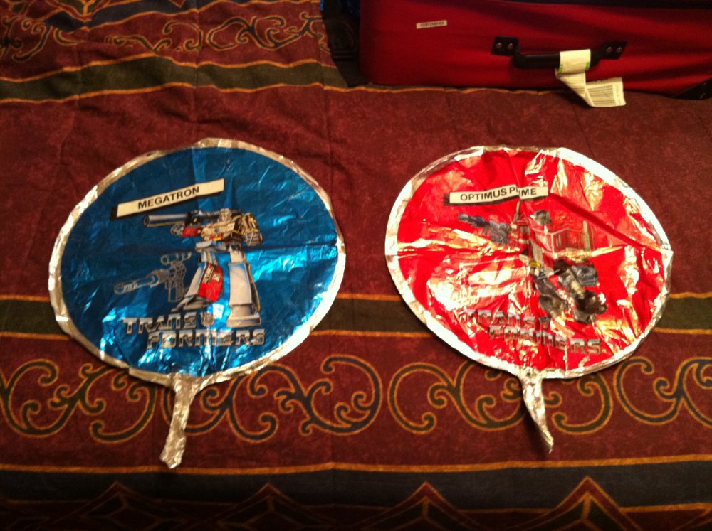 I picked up a small lot of Transformers items this week, really cheap. It included some books, a hat and an eraser, some of which I had already. The jewel of the lot though was a pair of 1985 Mylar balloons of Optimus Prime and Megatron. They are used, and could be in better shape, but they aren’t bad for twenty-five year old used balloons. I love G1 artifacts life this