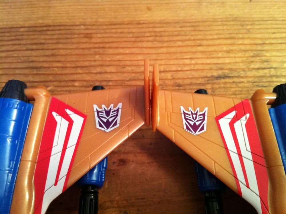 I heard recently that there is a variant of Transformers Generations Deluxe Dirge. Early versions have an incorrect Decepticon symbol on both his wings and chest. I didn’t notice it until someone told me there was an error and I looked at it, then I saw it right away. The white triangle in the crown is missing. All the ones I had seen were errors until yesterday when I found a corrected one at a Target. I didn’t even notice until I heard there was an error and then caught it as soon as I looked at the symbol.