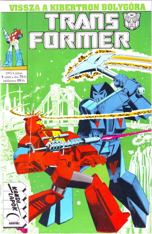 Here is a Transformers comic book from Hungary, issue #8. The cover used is a slightly different version of the art from Issue #18 of the original Transformers run. I haven’t had this very long and haven’t had a chance to compare it to my US issue #18 (or #8 for that matter). As you can see from the date on the cover, it was published in 1992, long after the US comic series ended. It seems that many US comics were later released in European countries.