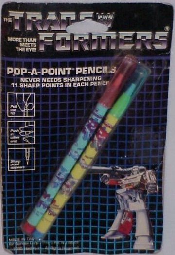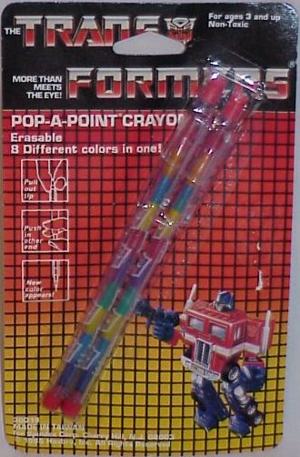 Transformers Pop-A-Point Pencils and Crayons made by Spindex Corporation in 1985. These are some of the many school supplies/art items from the glory days when they would stick the TF logo on almost anything. I miss those days.