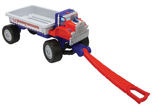 Here we have a newer item, a 2011 Transformers: Dark of the Moon, Optimus Prime Rollout Wagon. So cool. I was going to pass on this since it was kind of expensive, but Toys R Us had a special 6-hour sale one evening. This was also half price, and Optimus Prime Ride On Toy.