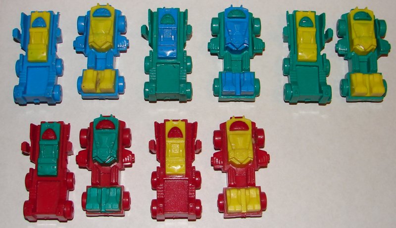 Here is a not quite complete set of 1985 McDonald’s Transformers toys. These are pretty hard to find, as they were only available in the St. Louis area. There were four toys, Gears, Brawn, Bumblebee, and Cliffjumper that were available in a multitude of colors. I am still missing both Gears and Brawn in blue/red and teal/yellow, as well as Bumblebee in teal/black (I have not seen any confirmation of a Cliffjumper in teal/black).