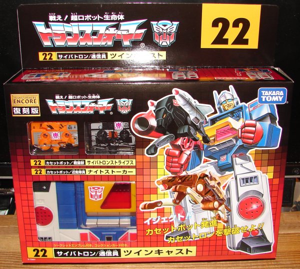 Twincast: Just as they did with Soundblaster, Twincast has tape door open and closed versions of the box art. They used the tape door open version, removing Steeljaw. They also recolored his face to match the toy with a gold face instead of silver and blue eyes instead of red eyes.