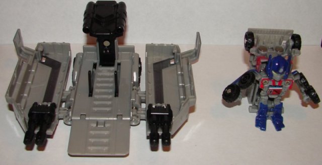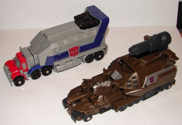 I kind of like these. The trailers are pretty cool, though it would have been nice if the weapons were spring loaded to deploy when you press the button to open it up. The Megatron trailer connects more firmly to the vehicle. The Optimus Prime trailer will come off pretty easily if you shake it.