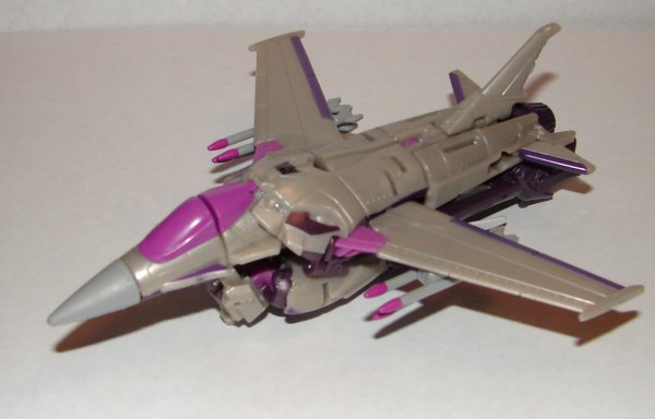 Starscream: This is the Transformers Prime First Edition Starscream repainted. I really like the repaint colors, gray with light and dark purple, but with the exception of the tips of the missiles, which are now painted, this one is far less detailed than the original. Nice overall though. No mold changes here that I can detect.