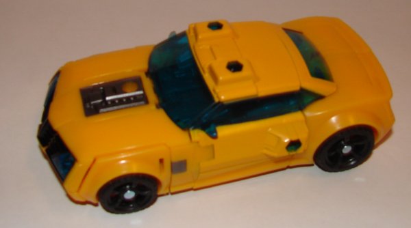 Vehicle Mode: As you can see above, Bumblebee comes out of the package with very few paint apps. Even after applying the stickers, he still has less detail than the American one. While he has taillight stickers, an improvement over the US version, the stickers aren’t the same color yellow as the plastic and they didn’t even paint the edges of the windows and rear view mirror, leaving them in translucent blue plastic. He has Arms Micron ports on the roof and doors. Instead of just adding holes, they built up little platforms topped off by the ports. I like the molding, but it needed to be painted. The stickers just don’t look great. The only plus on the stickers is the inclusion of the Autobot logo on the hood. He is a slightly darker yellow than the US version.