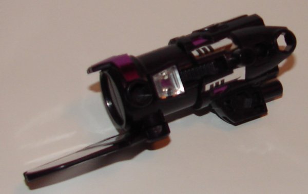 Weapon Mode: Gora is made to look vaguely like Megatron’s regular cannon, but it doesn’t look that good. He is molded in slightly metallic purple plastic and has nice looking shiny sliver and purple stickers.