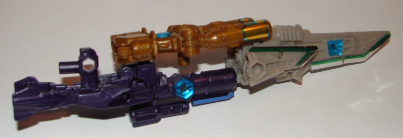 Weapon Mode: O.P. (yes, that’s really his name) is my favorite of the weapon mode Arms Microns (or is at least tied with R.A.). He is a dark purple cannon. The shiny blue stickers can’t even be seen against the plastic at certain angles. Would have been ricer with red highlights. He also has his own port on top to mount other Arms Microns.