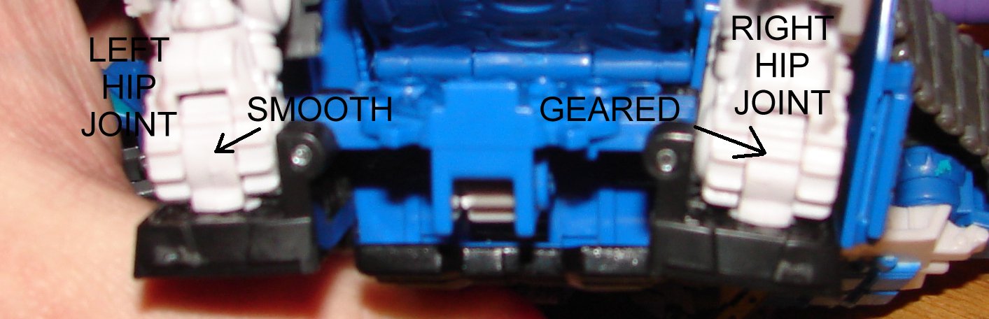 As you can see from the picture, the left hip joint is smooth inside, while the right hip joint is geared. This means that when you move his right leg out to the side (making his feet farther apart) it ratchets. When you make the same motion with the left one, it just moves smoothly. Now, a good question is, which way is correct? I can’t put my hands on my Bludgeon, but my Banzaitron has both legs showing the gear and ratcheting. The reason I’m not 100% sure this is correct, is because of his feet. On this mold, the feet are set at an angle, so he must stand with his feet apart. Problem is, the ratcheting makes it impossible to make the bottoms of his feet parallel with the surface he’s standing on. Either his legs are too close together and he’s standing on the outside edges of his feet, or they are too close together and he’s standing on the inside edges of his feet. Whichever way it’s supposed to be, the two of these I’ve seen are both wrong.