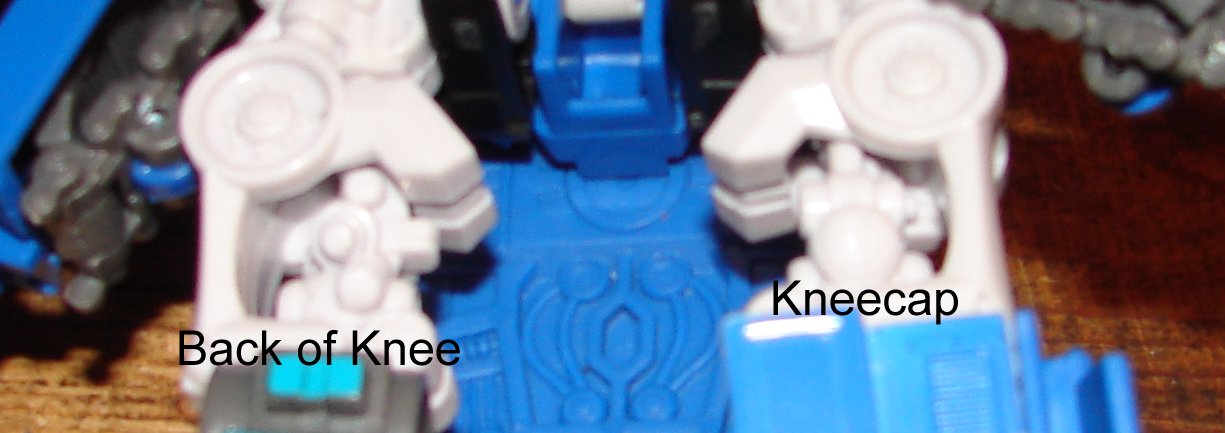 The knees are installed backwards on at least some Gigatrons. The picture above shows what the knee and back of the knee should look like, but on many the kneecap is on the back.