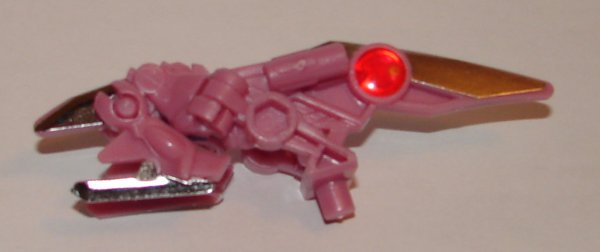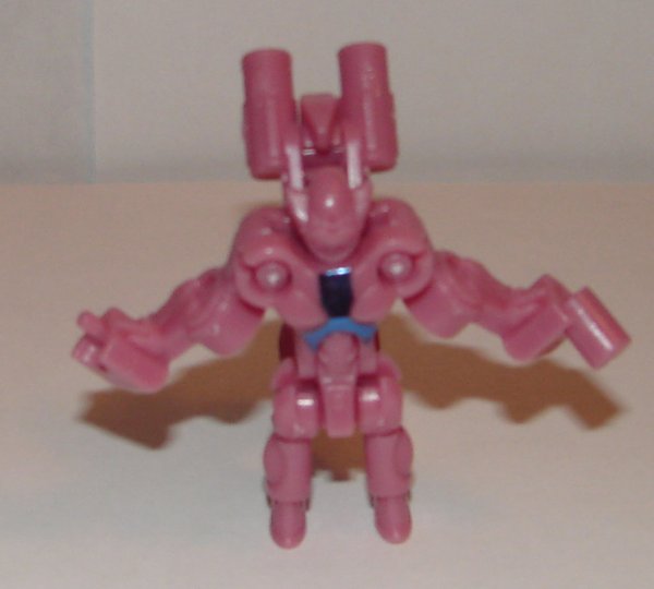 Robot Mode: In robot mode they have added two new Arms Micron pegs (rather than ports) on her “wings”. What I find interesting about this change is that, unlike the other toys in the series where they altered the mold (or made a mold with new parts) the new pegs were clearly part of the micron mold as there is no other pink plastic on the toy. It’s impossible to tell how they are connected. Unless they remolded some kind of latch into the door behind the peg (which they very well could have done since all the stamping on the wings is different) then they are just glued on. I’m not going to risk damaging mine to find out, but I wonder if they are just glued on or if they modified the door so it can clip in. If it’s glue, I’m dubious how well they would hold out to being used a lot.