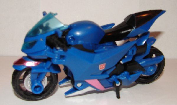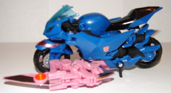 Vehicle Mode: In vehicle mode Arcee has no new Arms Micron ports. The only place to attach weapons, are on either side of the front wheel. They should have put a raised one on the back of the seat.