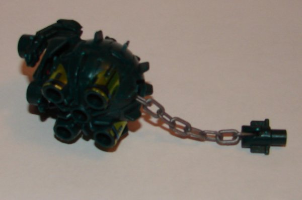 Weapon Mode: B.H. is pretty awesome. He has two weapon modes. He can be a gun or a mace. (Technically, he has a third mode. If you leave the chain inside and peg him on to Bulkhead’s hand he is more similar to Bulkhead’s weapon in the show.) It looks really great in gun mode. In mace mode, he suffers from some bulk, but the handle has to go somewhere, so it really can’t be helped. He is nicely decorated with stickers and I like the dark green color.