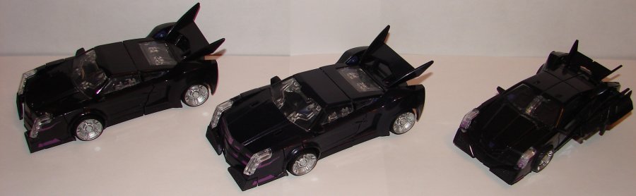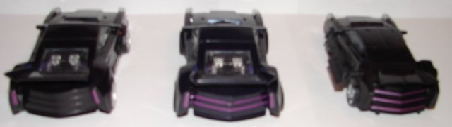 I love the design of the First Edition toy, though it does look like it could be a transforming Batmobile. The US version is dark purple, so dark that it almost looks black. The Japanese version is slightly lighter purple. Side by side the color difference is obvious, but I doubt it can be seen in the pictures. Other than that, the vehicle modes are identical accept for the rear bumper.