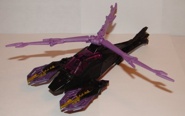 Robot Mode: What can I say? This is one of the worst Transformers toys ever. It’s on par with Universe Deluxe Tankor (maybe it’s even worse). It’s a steaming pile of dung. That’s about as clear as I can make it. Her legs look like they are only half as wide as they should be. Her arms are too flat, and her hands are a joke. They should have made this toy a Voyager and completely redesigned it. I don’t know why they wanted to go to the trouble of making her a spider that becomes a helicopter. It would have been so much better if they had just eliminated the spider elements all together. The head sculpt is nice, but that’s about the only positive thing I can say about this turkey. It is very disappointing. I was really looking forward to this one. It’s going to be the hardest to find in the assortment, which makes it doubly terrible that you’ll have to actually work to track this down.