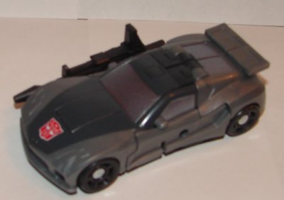 Vehicle Mode: The color scheme is based on the G1 Bluestreak’s animation model. It’s really nicely done. They have added holes in his doors to mount his gun, but the design of the gun makes it only fit on one side.