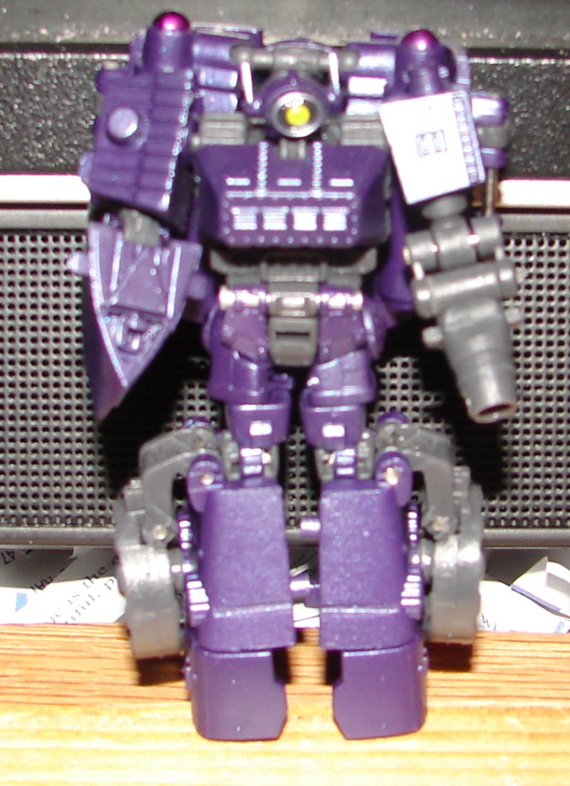 In robot mode he is an imposing figure. He has Shockwave’s signature cannon hand and a perfect G1 modeled head. Also, the anchor weapon attaches to his cannon arm with the chain, sort of simulating a hose. The only major complaint I have is that his right arm is way to bulky and his upper arm joint is very loose. Other than that, he’s just plain awesome looking!