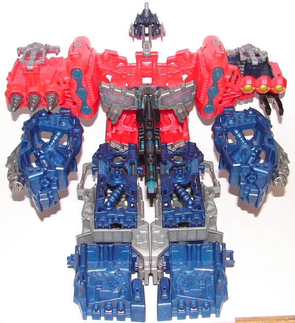 This toy is a piece of crap. If you haven’t seen one up close, you can put a Cyberverse Commander Optimus Prime in his chest to pilot him. He has places for Commander and Legion figures on his shoulders, forearms (if you tilt them up) and in his legs and feet. He has lights and sounds, and some springless missiles on one shoulder. That’s it. He transforms much like G1 Metroplex becoming some kind of rolling base, but without all the cool accessories and gimmicks that Metroplex had. That’s it. I am not a fan of toys being too articulated, but not only does he not have shoulder joints, his arms can only rotate up and down at the elbow. There is no rotation side to side. He’s just a hunk of plastic that doesn’t do much.