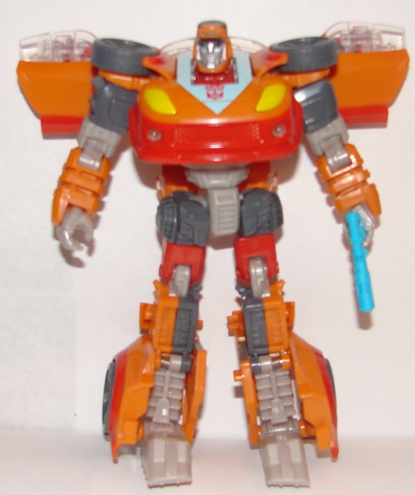 Robot Mode: The new head is really well done and the great paintjob carries over to the robot mode. His new slingshot accessory was cleverly designed with a peg on the side so it can still be stored under the car. I kind of wished they had molded in the pocket and elastic as part of the slingshot instead of just the Y shaped frame, but it’s still clear what it is supposed to be, so I can’t complain too much.