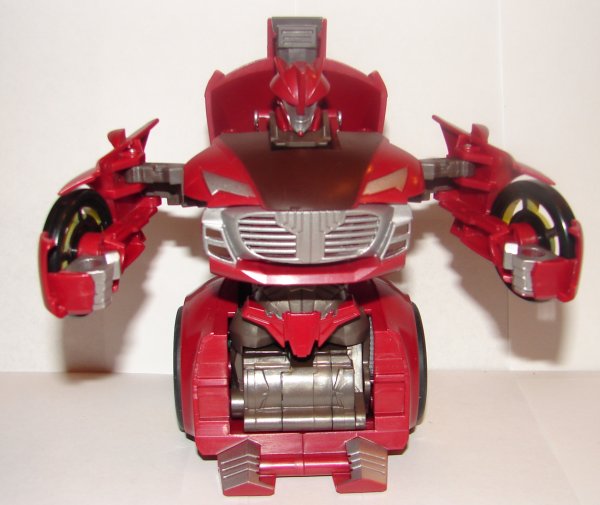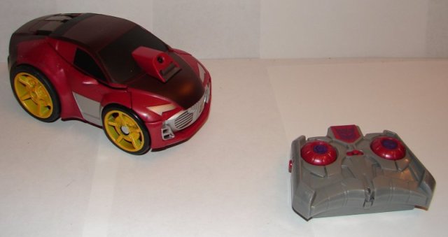 This is the definition of a crappy toy. This toy sucks. I was expecting a true remote control car, and it really isn’t. You need to have the remote pointed at the sensor on his front in car mode and on his back in robot mode. It’s crap. The non-transforming remote control cars from the RPMs line were much better.