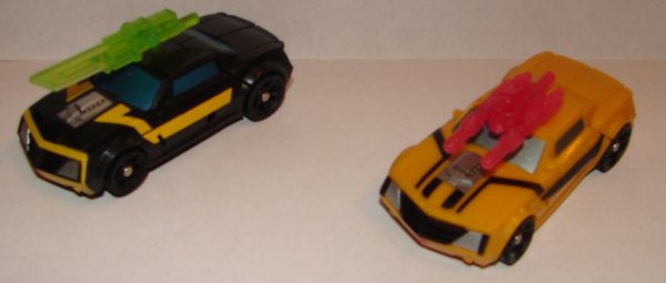 Hyperspeed Wheeljack is a repaint of the Wheeljack that came with the Star Hammer vehicle. He has been repainted to (loosely) resemble the Diaclone Marlboor Wheeljack. Click here for more information. It’s nice looking, but I think I prefer his original paint job, though Diaclone collectors will likely want to pick it up. Like Quickblade Bumblebee, he has a green gun. I kind of prefer the gun to the swords since there is nowhere to store the swords in vehicle mode accept on his roof. At least the gun looks good there.