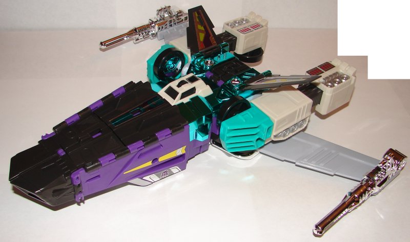 The robot mode picture clearly shows the differences between the reissue and the original. (Note: I never got the first reissue, but as I recall it was identical to the original.) As you can see the major changes are the chromed chest and guns. However the gray plastic used for the wings (also used for the fold out guns in his legs) are a darker gray than the original. The tank treads on his arms are now painted silver. The flash is distorting the coloring off the metallic stickers. The new stickers have darker colors and a shinier finish. The picture makes them look a lot darker on the new version than they actually are. All his stickers came applied.