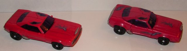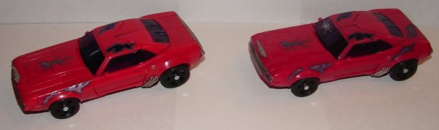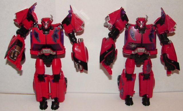 The differences between the TRU retail and SDCC 2012 Terrorcon Cliffjumper are pretty straightforward. The TRU Retail version is lighter red that the SDCC version. It is also missing the energon tampos on his left rear fender, left trunk, right front fender, right door, and left thigh. He’s also missing the crack in the windshield. The only other difference is the three-barrel cannons that you can flip out in place of his hands. The TRU retail version has them painted silver, while it is just left black on the SDCC version.