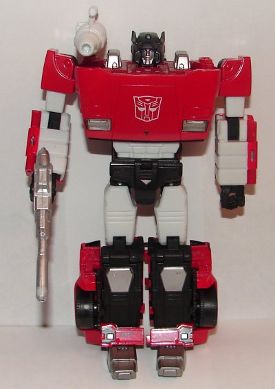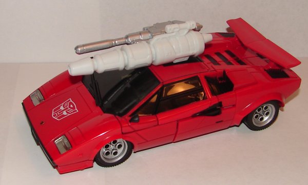 The Good: While he doesn’t transform exactly like the original, Sideswipe is a perfect cross between the G1 animation and the G1 toy. Just look at the pictures. Obviously the G1 guns couldn’t be mounted on the roof, but I really like that change. He’s got a really nice transformation, detailed without being super complicated like some Masterpiece toys are. He includes pile driver hand attachments, which are very cool.