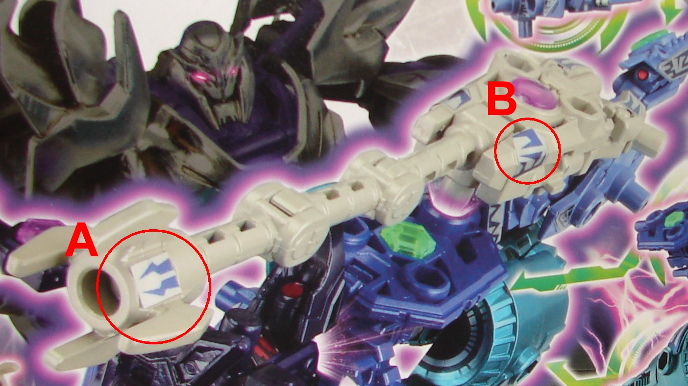 I noticed an oddity on the box of this one. In the picture above, note the stickers in the two circles. The one in circle A has been stuck on flat, but not properly flattened out. I suppose if you’re preparing the toy for a photo shoot, you might be trying not to mess it up. However, the one in circle B is simply ridiculous. The sticker has come loose on one side and is sticking up. I noticed it as soon as I looked at the box. I don’t know how they could have messed this up. (Of course, we’ve seen package and promotional pics of toys that were incorrectly transformed, but I usually expect higher quality on Japanese toys.) It’s not a huge deal, but I thought it was interesting.