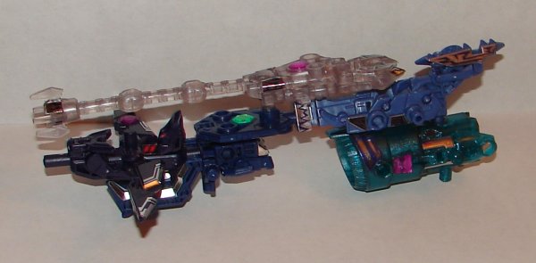 Weapon Mode: I really like a number of the combined weapons made from three toys. The problem is, the ones made from five begin to get cumbersome, and start to look a little ridiculous. This one is pretty decent, but it’s going to be very hard for any toy to hold it without falling forward. (As a sword, Advanced Star Saber can be held straight up, so if you position most any Voyager’s arms in the right position, you should be able to get a center of gravity that will let it stand.) The gun is not bad if you don’t mind it being held straight up or with the tip on the ground to help him stand up straight.