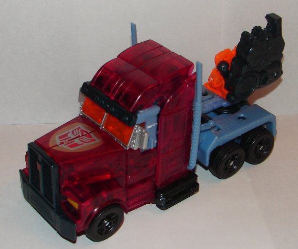 I am far less happy with the Dark Energon voyager toys than I was with the deluxe toys. Optimus Prime looks great, but they should have made the blue on his legs translucent too. I get that they can’t make the whole toy translucent, because translucent plastic often breaks more easily, but it seems to me that the blue plastic could have been made translucent without any problem.