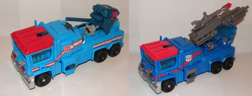 Vehicle Mode: In my previous blog about the USA version of Ultra Magnus I documented everything that was wrong with the toy. All of those things are still wrong, and, as hard as it is to believe they even made it worse. The gun on the USA version doesn’t stay on the back of the truck properly, but it at least looks like a gun. The hammer just looks stupid on the back of the truck. If they had included the missile that came with the USA version, then maybe that could have offset it. The reality is, he needed an Arms Micron that would have worked on the back of the truck, and using the hammer handle as a gun just doesn’t. It’s kind of pathetic, actually. On the plus side, the stickers for this toy really look nice and are far better cut than many previous Arms Micron toys.