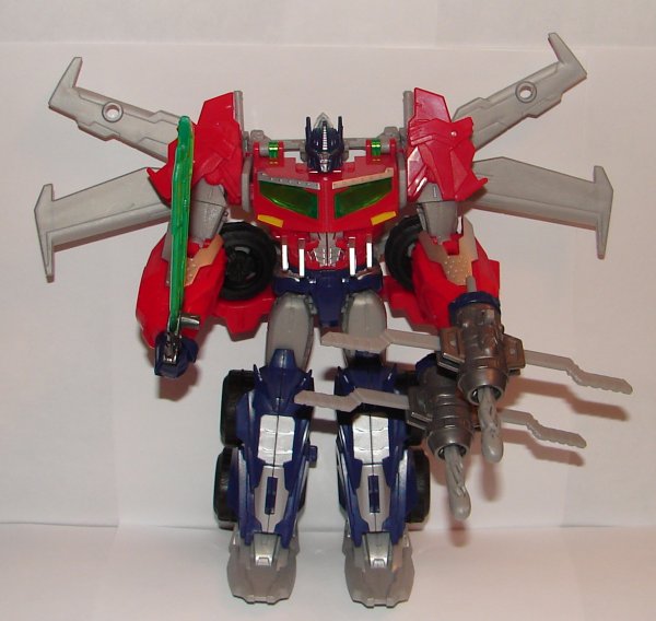Vehicle Mode: I really like Optimus’s vehicle mode. I wish they had used better plastic for the back and painted it. The gray makes it look cheap. Also, they could have found a way to attach his sword to the bottom of the vehicle rather than carrying it on his roof. He has one other flaw. You can’t see it in the picture, but when in vehicle mode you can see his face behind the cab. Again, this was a fixable problem that they didn’t bother to fix. A little bit of poor design. Still, I do like the look of it overall.