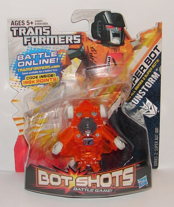 Sunstorm: Sunstorm is a straight repaint of the Starscream mold in translucent orange with white wheels. Interestingly, all the currently available Super Bots from the 2013 waves use the original molds. This might just be because they want to keep using those molds, but I have to wonder if the translucent plastic is problematic on some of the new designs. The Jump Shots especially seem to hit the surface with a lot of force to make them jump, and maybe they are worried about breakage. Of course, I might just be over thinking it.