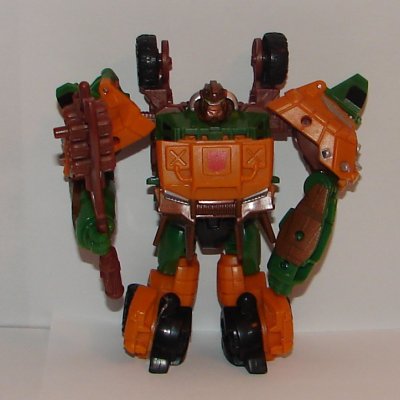 Robot Mode: His head has been remolded with horns that slope downward. I’m curious to see if he has horns in the cartoon. I am seriously disappointed with his weapon. It’s fine in vehicle mode as a missile launcher, but in robot mode it is supposed to be a battle axe. The problem is that the missile becomes the handle and it’s not held securely by the launcher. This means that when Bulkhead is holding the handle, the axe head swings back and forth. It’s a major design flaw, and one that would seem to have been easily corrected.