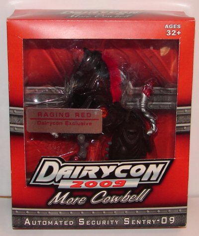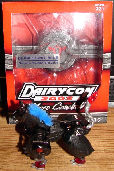 Just picked up a Dairycon 2009 “Raging Red” Automated Security Sentry 09, AKA ASS-09, the Donkey of the Apocalypse. (No, I’m not kidding, really.) He is repainted from a Transformers Beast Machines Basic Battle Unicorn. He’s mainly black with silver and translucent red. His mane is made from a red pipe cleaner.