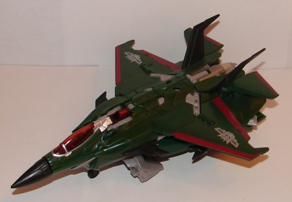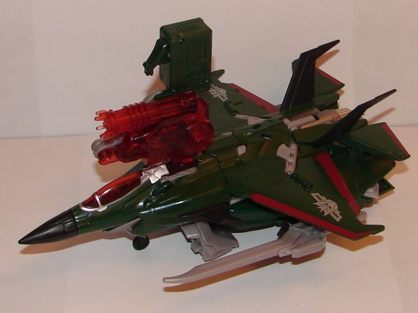 Vehicle Mode: In case this sounds familiar, Much of this review is taken from my Dreadwing review. His gun has been remolded, but it is still crap. Let’s just get that out of the way. Moving on. The jet mode looks awesome with the exception of the half circle gray plastic pieces under the fuselage. They look kind of silly, but that’s not a huge deal. The back end of the plane has some issues. The arms don’t connect into the ports under the back of the jet properly. Still, these issues aside, the vehicle mode looks fantastic. I love it in green with red more than I did Dreadwing’s blue and gold. Unfortunately, the only storage for his sword is under his wing, which looks silly.