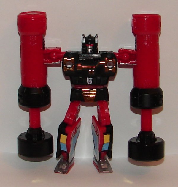 I didn’t get a picture of it, but in robot mode, Soundwave can use Rumble’s pile drivers as a double barrel cannon.