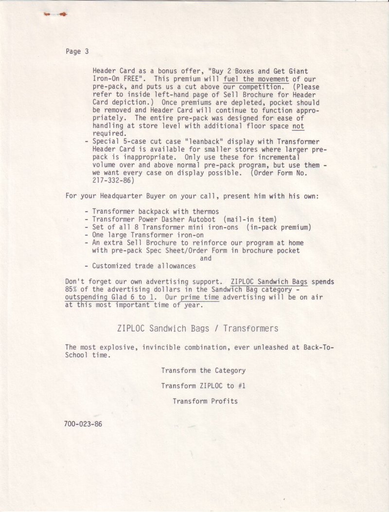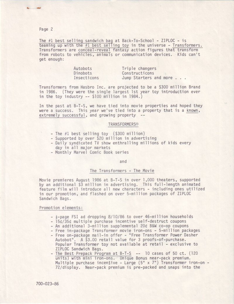 The third sheet in the packet actually has some really interesting information on it (or at least, interesting to me. It talks about the Transformers brand expecting to make $300 million in 1986. It also states that Transformers made $100 million in 1984, the most for any first year series ever at that time. I’m sure that record has probably been broken, but I’d love to know how that stacks up all time.