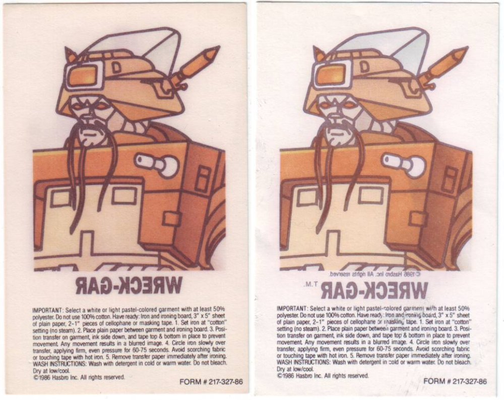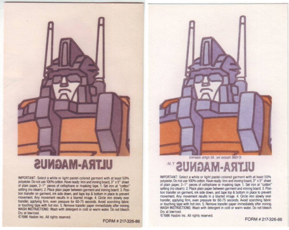 Above on the left is the Rodimus Prime large iron-on from the salesman kit. On the right is an actual one that you could get in store for buying two boxes of Ziploc bags. You’ll note a few differences between the two.