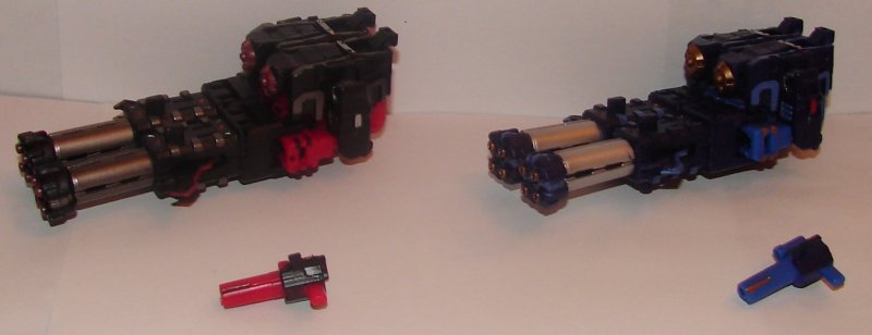Unlike the original toys, these do not transform into cassettes, but into weapons. That’s the main reason I bought them, I’m a big fan of Targetmasters. The cannon modes look great, and they have an accessory that gives them a different size peg so they can be used with many different toys.