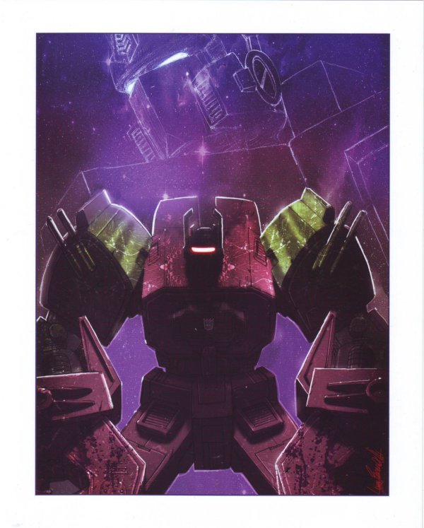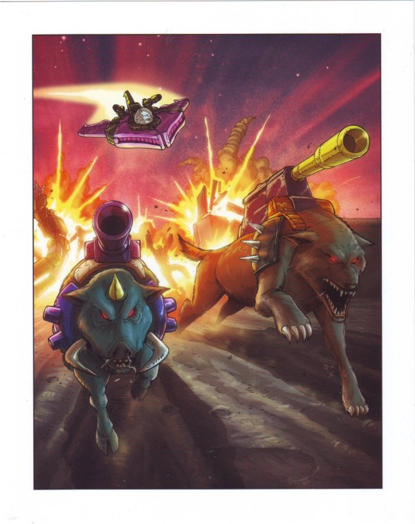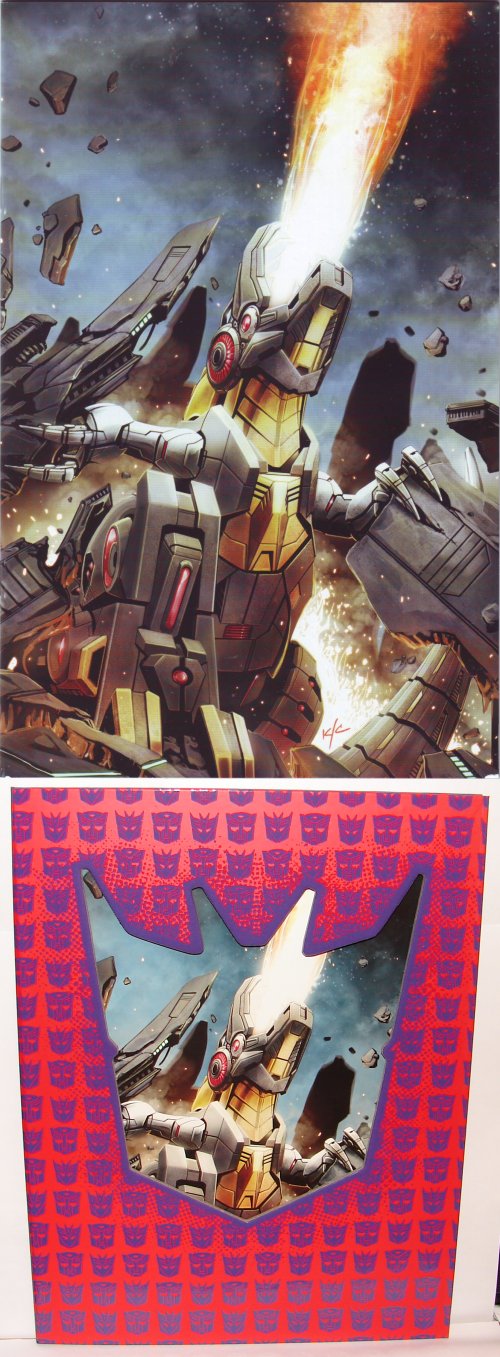 The comic folios themselves are generic. Also of note, the paper pocket glued to the inside for the comic is terribly designed. All of my covers are damaged because when you slide them in, they hit the inside piece that is glued on. It’s a lousy design, especially since they are $25 each. One was only available with the set for $100, but I don’t recall which. The issues were Regeneration One #92, Beast Hunters #1, Monstrosity #1, More Than Meets the Eye #17, and Robots in Disguise #18. Sound familiar? The image after the comic is the print that came with it.