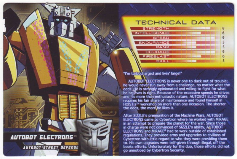 As to the name Electrons, they couldn’t use Electro because of the character from Spiderman. That is completely understandable. What is not understandable is that they call him Electro on his autograph card. They probably did that in the comic too, but I didn’t look. When you give a toy a name, you stick with that name. Calling it something else in a comic, on autograph cards, or anywhere else makes no sense whatsoever.