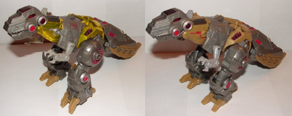 The main difference from the original Grimlock is that his dinosaur neck and robot chest are now metallic gold. There are a couple of other minor changes. The paint on his sides of his upper tail was all tan on the original, but now has some unpainted areas. Also there is some additional red paint apps on his dinosaur shoulders. The Platinum Edition is on the left in the pictures below.