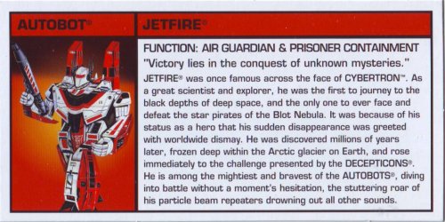 If you haven’t heard, this set is the subject of a lawsuit by Harmony Gold, the rights holder to Robotech in the USA. At issue is the Jetfire box art used on the tech spec. Hasbro had a one year right to manufacture Jetfire in 1984. Harmony Gold apparently claims that extends to the art as well. Harmony Gold demanded they be recalled. Harmony Gold is bat shit crazy if they think anyone is going to send back this toy because they are stamping their feet like whiny five year old. They want money from Hasbro. They may have a case if the liscense extended to the art as well. I hope they win a ton of money from Hasbro. Enough about that, I don’t really care anyway.