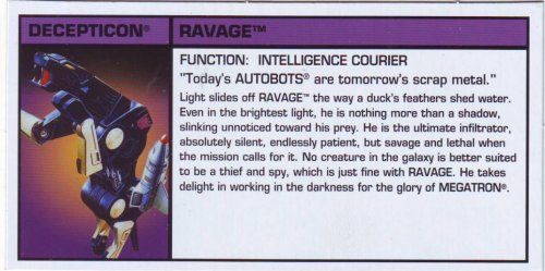 The jewel of the set, Ravage looks awesome. While some will hate this, his legs don’t move. To me, this makes him stand up better than the G1 toy ever did, so I love it.