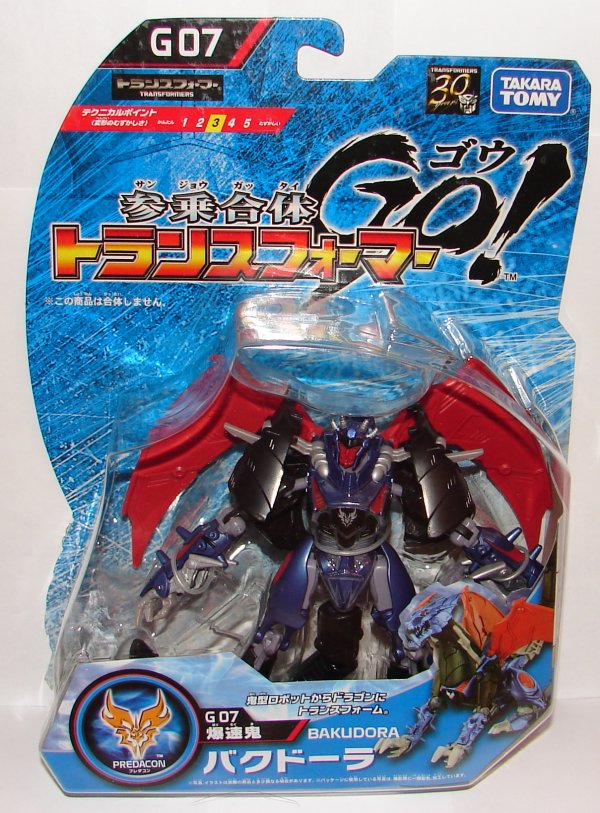 Bakudora is the Japanese version of Transformers Prime Beast Hunters Deluxe Ripclaw. He has a new paintjob and a new head. (Read my review of Ripclaw for more information on this mold.)