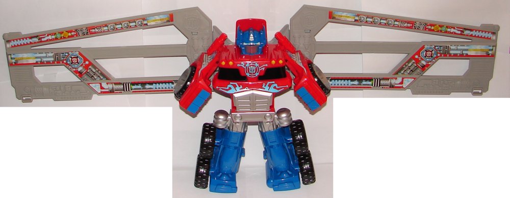 The Transformers Rescue Bots Optimus Prime Rescue trailer is essentially an upsized version of the regular Optimus Prime toy with a car carrier trailer that can carry other Rescue Bots toys added. The trailer also turns into a jet pack (or more correctly, half of it does, with the other half just being unused). It is a fairly flimsy trailer, but not awful. What is a bit lousy is that there are clear places on the trailer for stickers that do not exist. A few more stickers would have made it look a little better if nothing else.