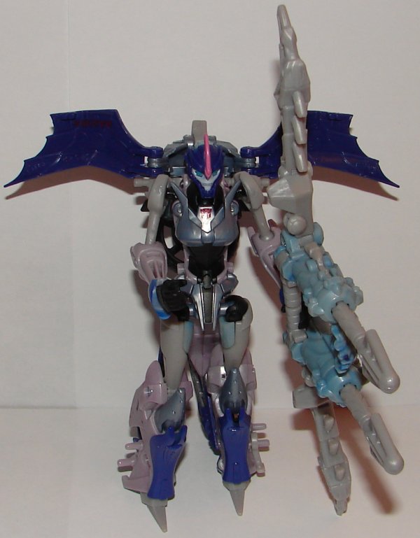 Robot Mode: Her robot mode has almost not been remolded at all, but the color changes are nice. Her wings were remolded a little as they are the sides of the cycle and were remolded, but most of the remolding is on the back. She does have a new head, which looks pretty good. I kind of like the new weapon, but it is so large that she can barely hold it.